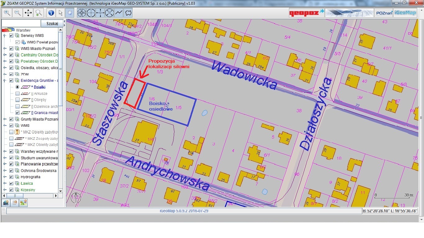 Uzasadnienie: Wskazana lokalizacja znajduje się na nieruchomościach będących w zasobie nieruchomości Miasta Poznania. Nieruchomości znajdują się w administracji Zarządu Dróg Miejskich (cz. działki nr 95, ark. 39, obr. Starołęka).